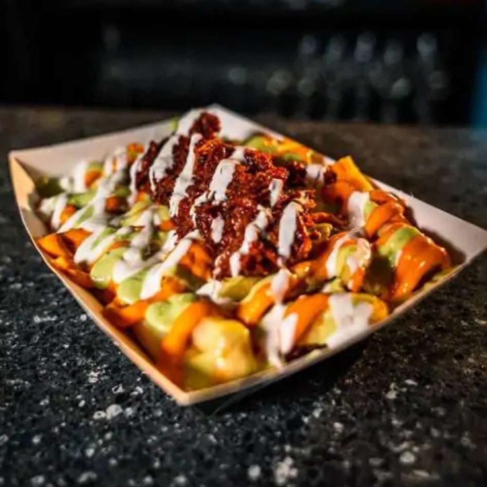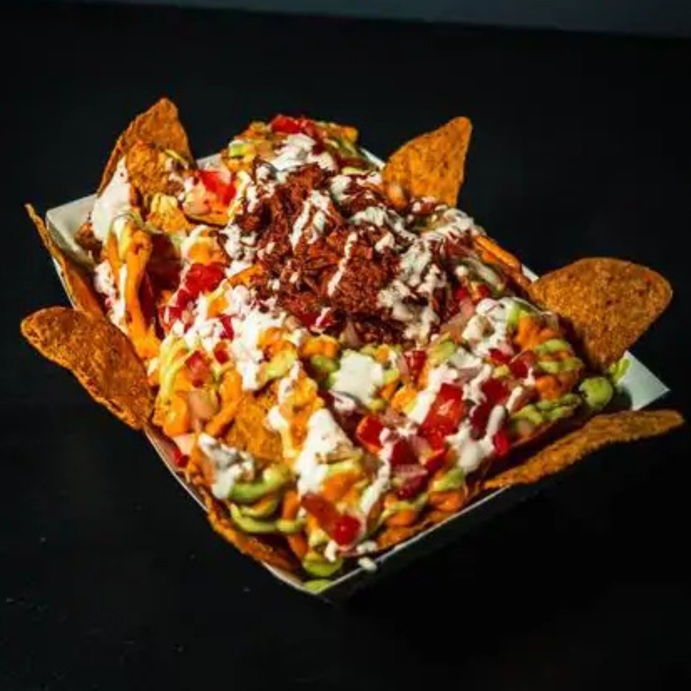 Totopos crujientes cubiertos con queso cheddar, salsa de aguacate, aderezo chipotle, nata, pico de gallo, jalapeños y por supuesto nuestro delicioso pulled pork.