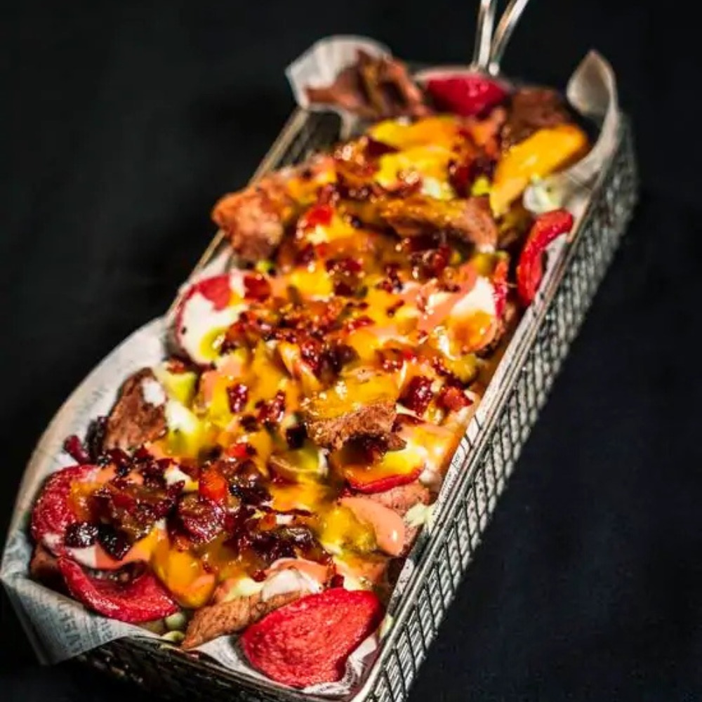 Patatas fritas servidas con queso cheddar, nata, bacon, aderezo chipotle y pulled pork.