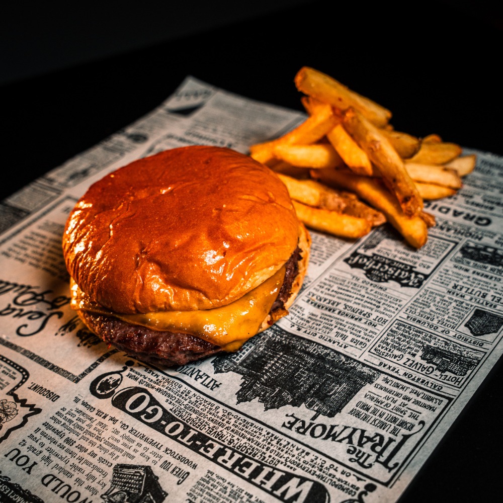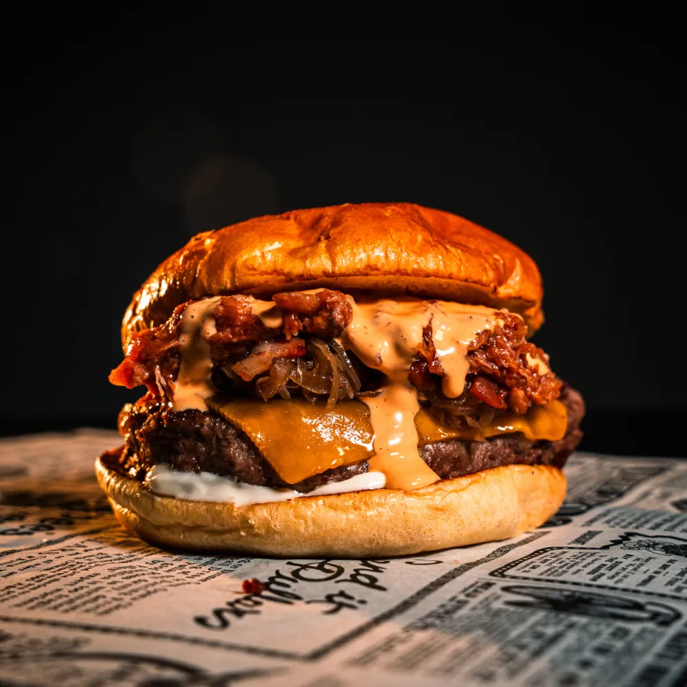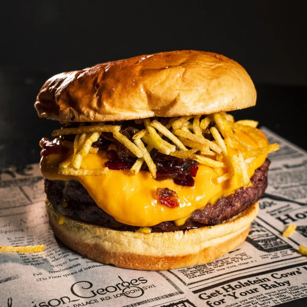 Servida en un delicioso pan brioche, con 200 g de carne de buey, cebolla caramelizada, queso cheddar, bacon crujiente, mayonesa y nuestra salsa de la casa.