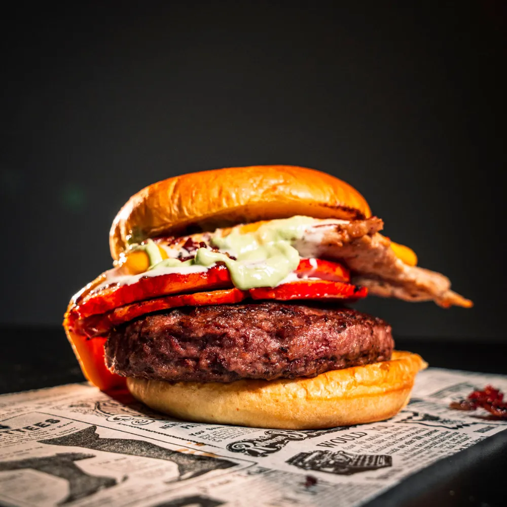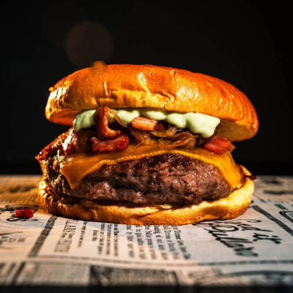 Una deliciosa hamburguesa con 200 g de carne de buey, mayonesa al ajo, generosa ración de pulled pork, bacon crujiente, cebolla caramelizada y salsa de aguacate.