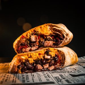 Este gran burrito te cautivará: carne asada de lomo de cerdo, arroz, frijoles negros, pico de gallo, fusión de quesos y salsa a elegir para un toque único.