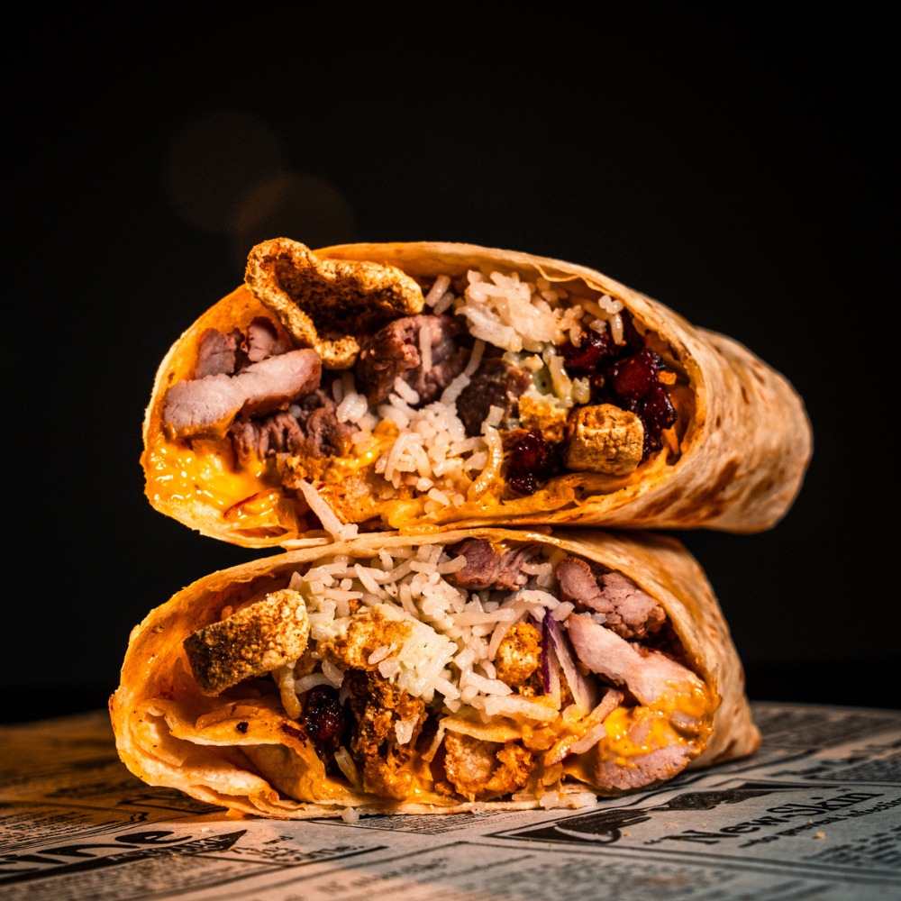 Delicioso y original burrito, con asada de lomo de cerdo, chorizo de las peñas, cebolla morada, arroz, trocicos de torrezno y queso manchego, salsa a elegir.